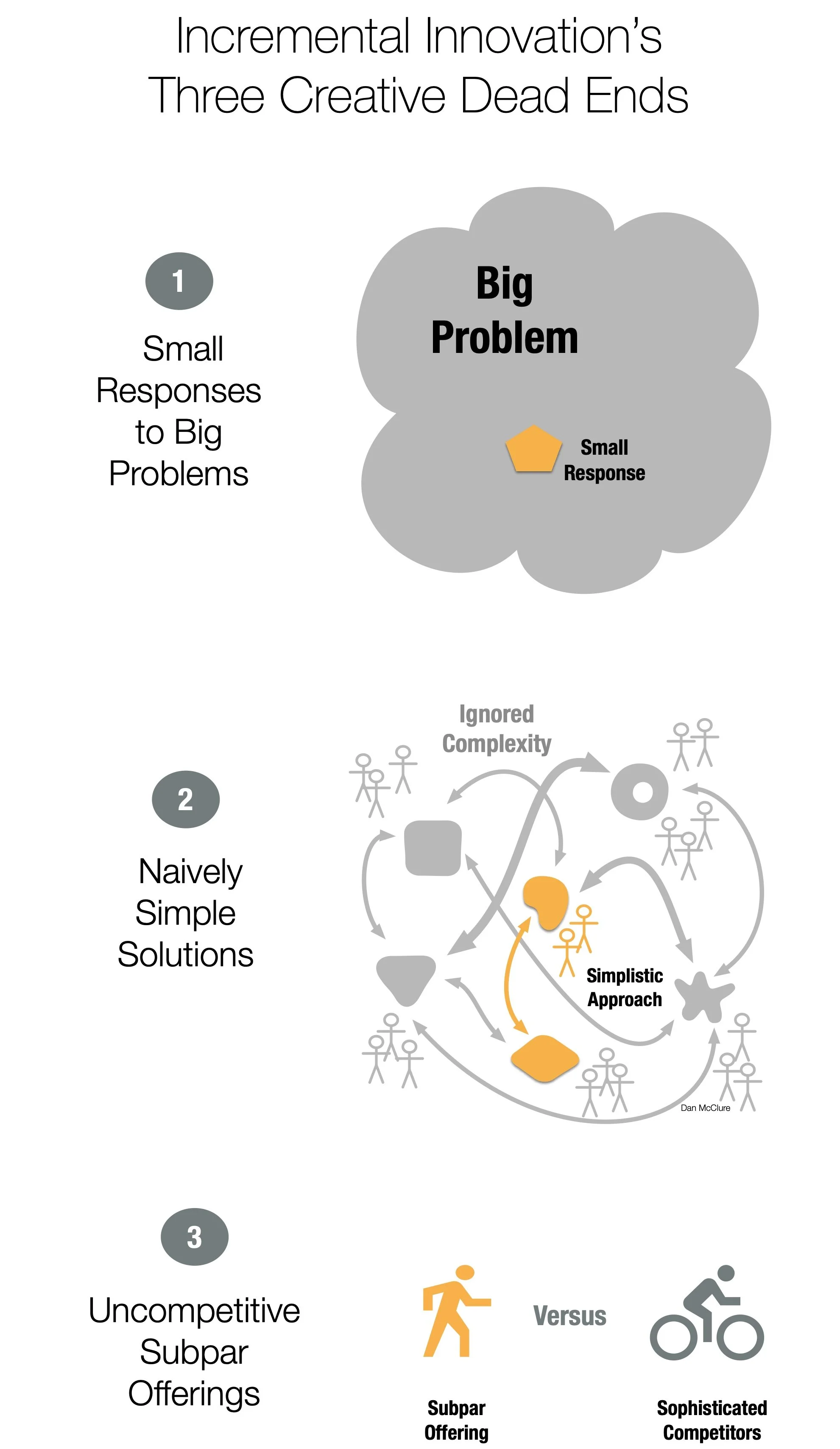 Even so, when organizations face existential threats, they often turn to their familiar toolkit, relying on incremental thinking and practices to drive transformative change. Unfortunately, tools designed for small, measured change lead to more ambitious efforts into three creative dead ends.