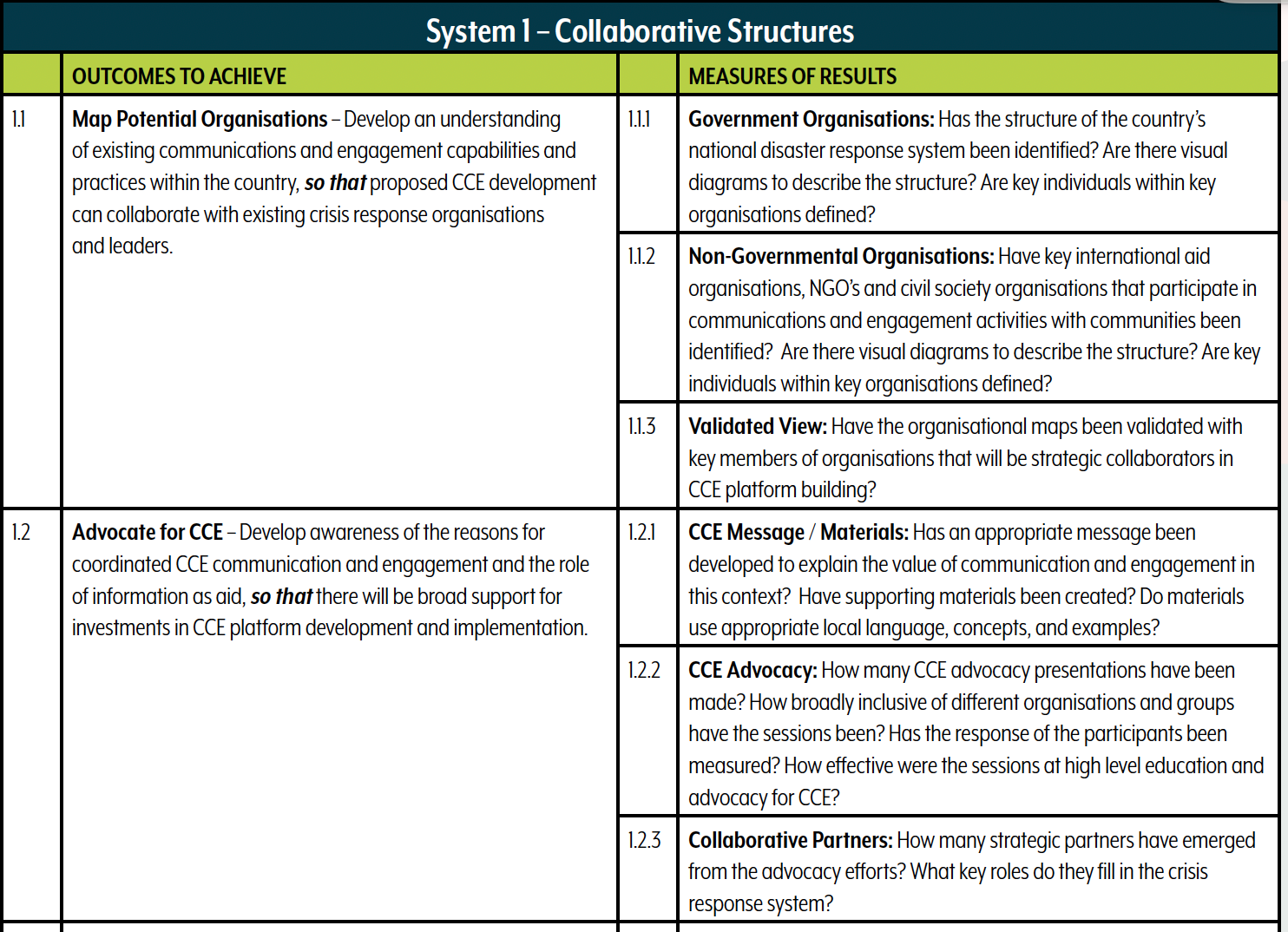 I worked with the CDAC team to create a measurement and evaluation (M&E or MEAL) framework that supports this kind of complex communication ecosystem building. Note how the elements to be evaluated focus on outcomes, and the measures are open ended regarding how the results are achieved.